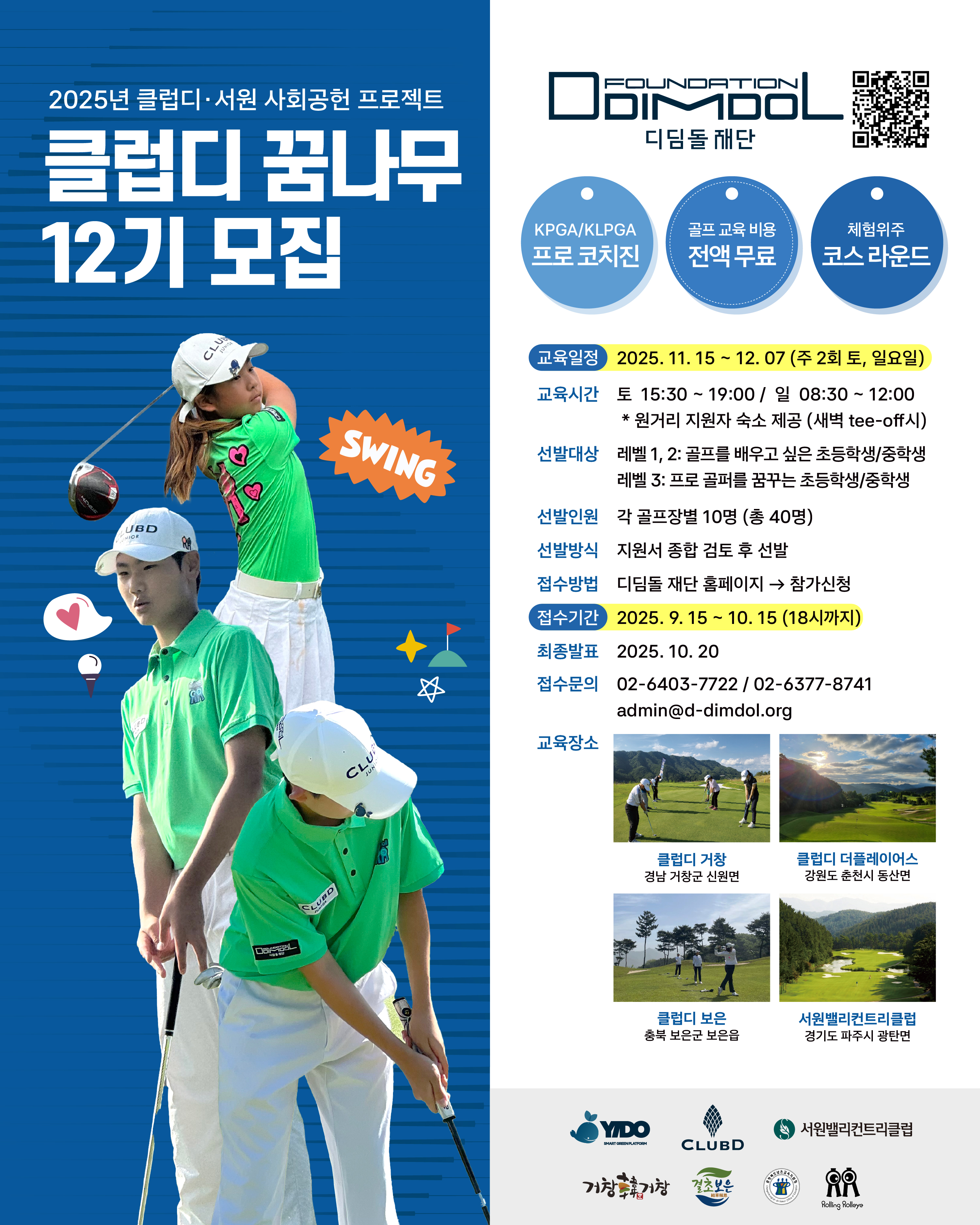 2023년 설립된 ‘디딤돌재단’은 골프 저변 확대와 청소년 성장 지원을 위해 클럽디 골프장 3곳 및 서원밸리 컨트리클럽에서 무상 골프 교육을 제공하고 있습니다.